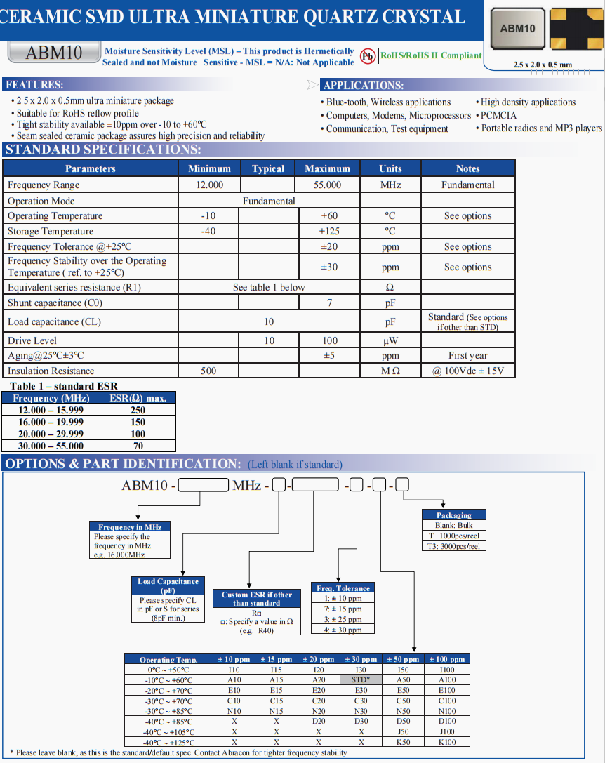 | ABM10-24.000MHZ-E20-T | Abracon | ABM10 | 24 MHz | ±20ppm | ±20ppm | 10 pF |