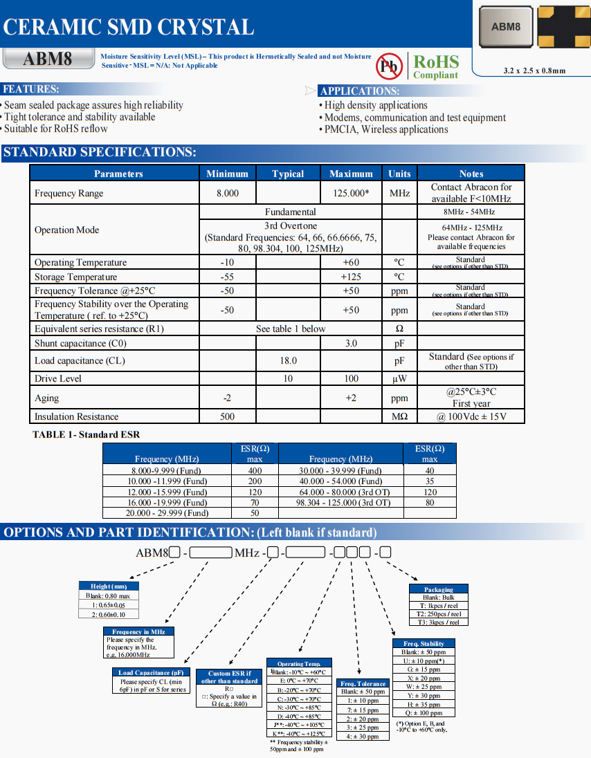 | ABM8-18.432MHZ-4-T | Abracon | ABM8 | 18.432 MHz | ±50ppm | ±50ppm | 4 pF |
