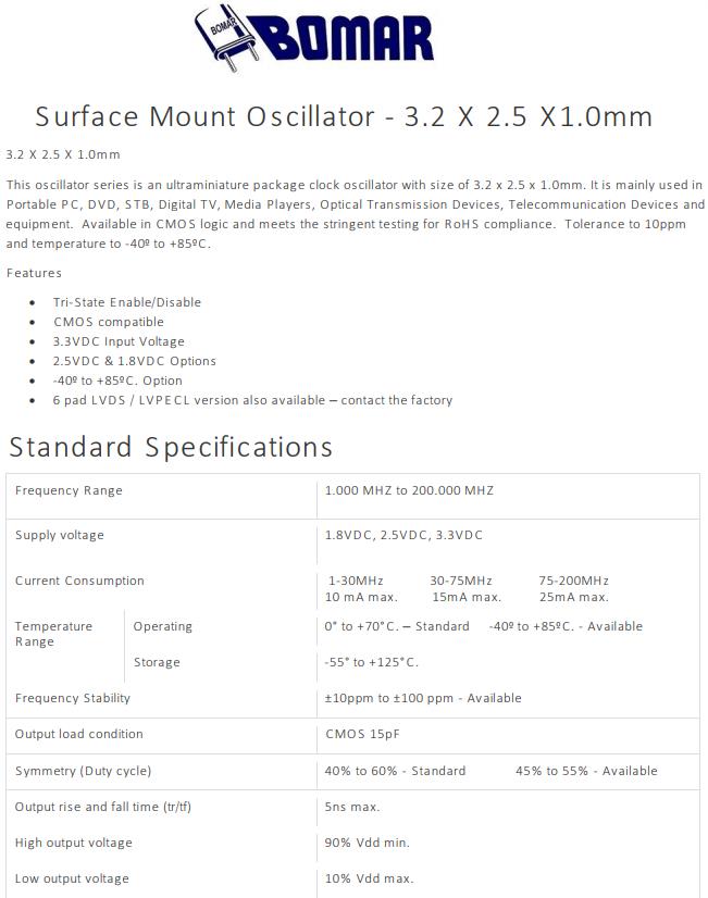 Bomar晶振,B1325-AABS3T-10.000000晶振,SMD晶體振蕩器,小型SMD有源晶振,從最初超大體積到現在的7050mm,6035mm,5032mm,3225mm,2520mm體積,有著翻天覆地的改變,體積的變小也使產品帶來了更高的穩定性能,接縫密封石英晶體振蕩器,精度高,覆蓋頻率范圍寬的特點,SMD高速自動安裝和高溫回流焊設計,Optionable待機輸出三態輸出功能,電源電壓范圍:1.8V~5V,高穩定性,低抖動,低功耗,主要應用領域:無線通訊,高端智能手機,平板筆記本WLAN,藍牙,數碼相機,DSL和其他IT產品的晶振應用,三態功能,PC和LCDM等高端數碼領域,符合RoHS/無鉛.Bomar 成立于 1963 年,是一家為商業和雙向無線電行業生產石英晶體的制造商。該業務的性質要求在寬頻率范圍內具有嚴格的容差和高穩定性晶體,以滿足嚴格的 FCC 規范。快速生產的需求對我們不斷增長的客戶群很重要。我們的許多客戶都是當地、州和聯邦警察和監視機構。Bomar 很快不僅成為該市場的領先供應商,而且因其產品質量、快速周轉時間和無與倫比的客戶服務而獲得一致認可。