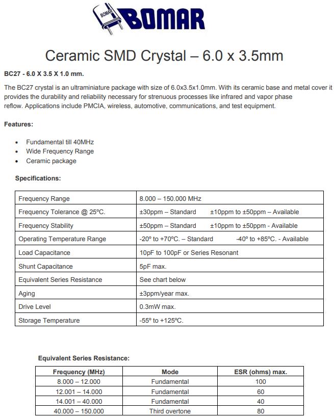Bomar晶振,BC27晶振,BC27EFD120-10.000000晶振,貼片晶振本身體積小,超薄型石英晶體振蕩器,特別適用于有目前高速發(fā)展的高端電子數(shù)碼產(chǎn)品,因為晶振本身小型化需求的市場領(lǐng)域,小型,薄型是對應(yīng)陶瓷振蕩器(偏差大)和普通的石英晶體振蕩器(偏差小)的中間領(lǐng)域的一種性價比較出色的產(chǎn)品.產(chǎn)品廣泛用于筆記本電腦,無線電話,衛(wèi)星導(dǎo)航SSD,USB,Blu-ray等用途,符合無鉛焊接的高溫回流焊曲線特性.