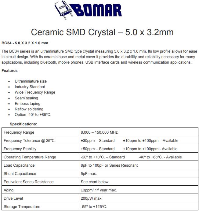 Bomar晶振,BC34晶振,BC34EFD120-10.000000晶振,智能手機晶振,產品具有高精度超小型的表面貼片型石英晶體振蕩器,最適用于移動通信終端的基準時鐘等移動通信領域.比如智能手機,無線通信,衛星導航,平臺基站等較高端的數碼產品,晶振本身小型,薄型具備各類移動通信的基準時鐘源用頻率,貼片晶振具有優良的電氣特性,耐環境性能適用于移動通信領域,滿足無鉛焊接的高溫回流溫度曲線要求.