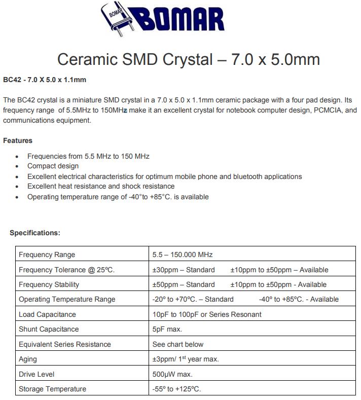 Bomar晶振,BC42晶振,BC42EFD120-10.000000晶振,貼片晶振本身體積小,超薄型石英晶體振蕩器,特別適用于有目前高速發展的高端電子數碼產品,因為晶振本身小型化需求的市場領域,小型,薄型是對應陶瓷振蕩器(偏差大)和普通的石英晶體振蕩器(偏差小)的中間領域的一種性價比較出色的產品.產品廣泛用于筆記本電腦,無線電話,衛星導航SSD,USB,Blu-ray等用途,符合無鉛焊接的高溫回流焊曲線特性.Bomar 成立于 1963 年,是一家為商業和雙向無線電行業生產石英晶體的制造商。該業務的性質要求在寬頻率范圍內具有嚴格的容差和高穩定性晶體,以滿足嚴格的 FCC 規范。快速生產的需求對我們不斷增長的客戶群很重要。我們的許多客戶都是當地、州和聯邦警察和監視機構。Bomar 很快不僅成為該市場的領先供應商,而且因其產品質量、快速周轉時間和無與倫比的客戶服務而獲得一致認可。