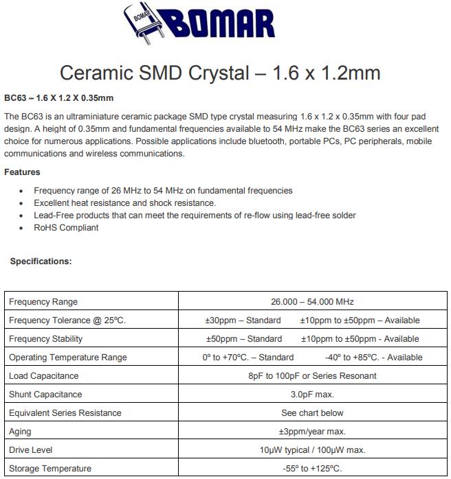 Bomar晶振,BC63晶振,BC63EFD120-30.000000晶振,貼片晶振本身體積小,超薄型石英晶體振蕩器,特別適用于有目前高速發(fā)展的高端電子數(shù)碼產(chǎn)品,因為晶振本身小型化需求的市場領(lǐng)域,小型,薄型是對應(yīng)陶瓷振蕩器(偏差大)和普通的石英晶體振蕩器(偏差小)的中間領(lǐng)域的一種性價比較出色的產(chǎn)品.產(chǎn)品廣泛用于筆記本電腦,無線電話,衛(wèi)星導(dǎo)航SSD,USB,Blu-ray等用途,符合無鉛焊接的高溫回流焊曲線特性.Bomar成立于 1963 年,是一家為商業(yè)和雙向無線電行業(yè)生產(chǎn)石英晶體的制造商。該業(yè)務(wù)的性質(zhì)要求在寬頻率范圍內(nèi)具有嚴(yán)格的容差和高穩(wěn)定性晶體,以滿足嚴(yán)格的 FCC 規(guī)范。快速生產(chǎn)的需求對我們不斷增長的客戶群很重要。我們的許多客戶都是當(dāng)?shù)亍⒅莺吐?lián)邦警察和監(jiān)視機(jī)構(gòu)。Bomar 很快不僅成為該市場的領(lǐng)先供應(yīng)商,而且因其產(chǎn)品質(zhì)量、快速周轉(zhuǎn)時間和無與倫比的客戶服務(wù)而獲得一致認(rèn)可。