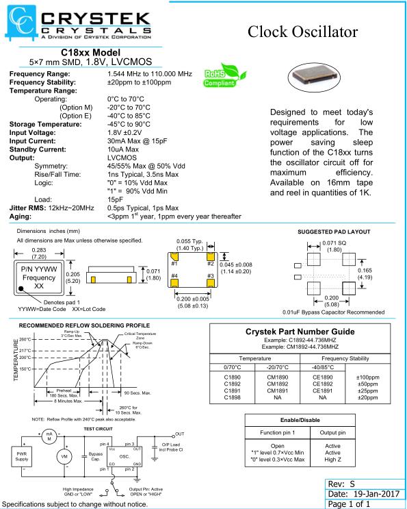 Crystek晶振,C18xx晶振,C1892-44.736MHZ晶振,小型SMD有源晶振,從最初超大體積到現在的7050mm,6035mm,5032mm,3225mm,2520mm體積,有著翻天覆地的改變,體積的變小也使產品帶來了更高的穩定性能,接縫密封石英晶體振蕩器,精度高,覆蓋頻率范圍寬的特點,SMD高速自動安裝和高溫回流焊設計,Optionable待機輸出三態輸出功能,電源電壓范圍:1.8V?5V,高穩定性,低抖動,低功耗,主要應用領域:無線通訊,高端智能手機,平板筆記本WLAN,藍牙,數碼相機,DSL和其他IT產品的晶振應用,三態功能,PC和LCDM等高端數碼領域,符合RoHS/無鉛.