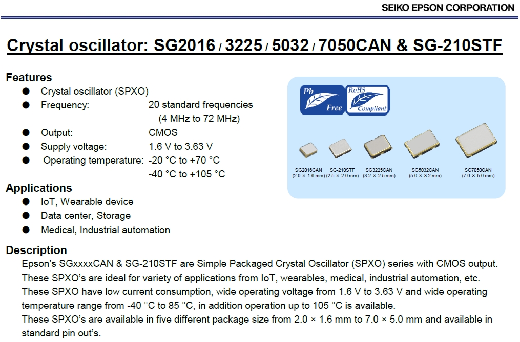 愛普生有源振蕩器,SG3225CAN 27.000000MHZ-KJGA,6G物聯(lián)網(wǎng)晶振,尺寸3225mm,頻率為27MHZ,支持輸出CMOS,產(chǎn)品是一款小尺寸高精度低抖動的SPXO晶振,有源振蕩器,愛普生有源晶振,醫(yī)療產(chǎn)品專用晶振,工業(yè)自動化晶振,可穿戴設備晶振,低電壓晶振,低功耗有源晶振,愛普生的SGxxxxCAN和SG-210STF是具有CMOS輸出的簡單封裝晶體振蕩器(SPXO)系列。這些SPXO是物聯(lián)網(wǎng),可穿戴設備,醫(yī)療,工業(yè)自動化等各種應用的理想選擇。這些SPXO具有低電流消耗,寬工作電壓從1.6 V到3.63 V和寬工作溫度范圍從-40°C到85°C,另外工作溫度可達105°C。這些SPXO有五種不同的包裝尺寸,從2.0×1.6毫米到7.0 × 5.0毫米,可在標準引腳。