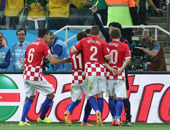 下半場,克羅地亞防守隊(duì)員在禁區(qū)內(nèi)拉到了巴西隊(duì)員弗雷德,裁判的直接判罰點(diǎn)球讓本來就對裁判此前的判罰有頗多意見的克羅地亞人更加憤怒,直接把裁判圍了起來。可是再怎么爭論也沒用,又是內(nèi)馬爾,主罰點(diǎn)球一蹴而就。雖然克羅地亞門將撲到了皮球,但皮球還是速度太快,飛進(jìn)了網(wǎng)窩。