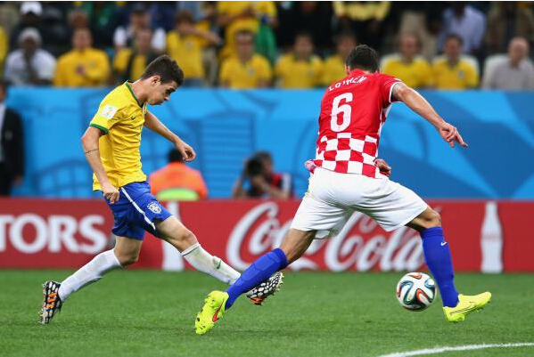 補(bǔ)時階段,巴西球星奧斯卡帶球長途奔襲,克羅地亞兩名隊(duì)員夾防,本以為這球再不分給左側(cè)隊(duì)友就沒了,可不想奧斯卡輕巧腳尖一捅直線射門,讓克羅地亞門將措手不及,巴西人第三次攻破對手球門。3:1的比分就此定格。
