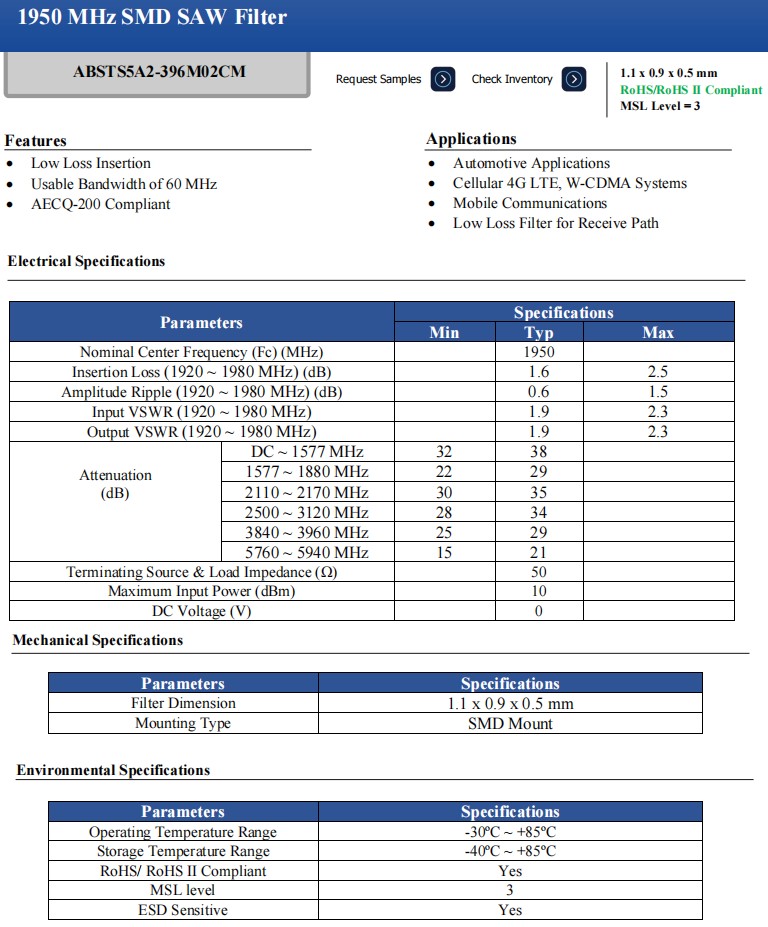 用于接收路徑的低損耗濾波器ABSTS5A2-396M02CM