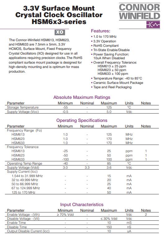 SPXO振蕩器特點:1.0至170MHz,3.3V工作電壓,符合RoHS標準,三態(tài)使能/禁用,省電功能: 禁用時10uA,整體頻率容差: HSM613,25ppm,HSM623,50 ppm,HSM633,100ppm溫度范圍:-40至85攝氏度,陶瓷表面貼裝封裝,膠帶和卷軸包裝.