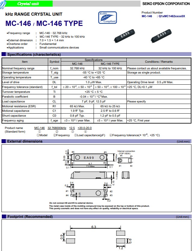 | Q13MC1462001700 | 7x1.5x1.4mm | MC-146 | 32.768kHz | 12.5pF | +/-10.0ppm | -40 to +85°C |