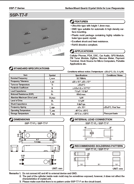SSP-T7-F貼片晶振,也稱精工表晶,是日本精工晶振公司現(xiàn)在推出的銷量最多的一款32.768KHZ晶振,SSP-T7-F有高溫度物力化學(xué)性能以外,還有彈性震動耗損小,現(xiàn)在在品質(zhì)要求可以百萬分之一的特點,因此它是一種頻率穩(wěn)定的電子元件,應(yīng)用廣泛于無線電,通訊,鐘表等產(chǎn)品上面的.