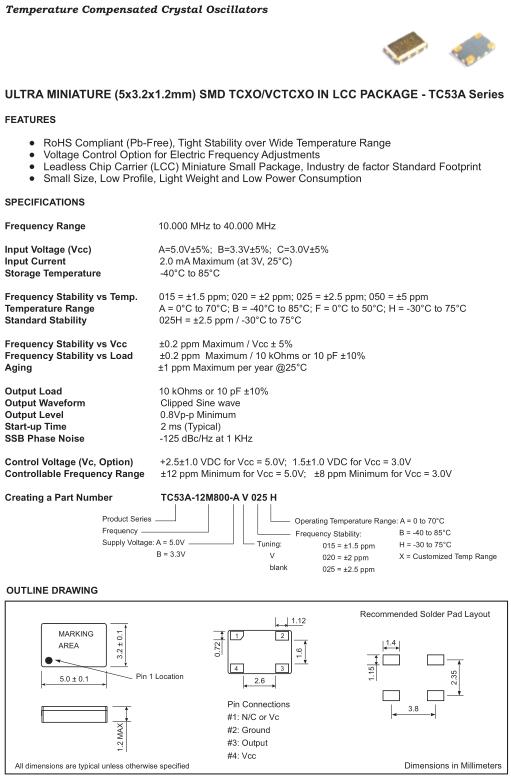 Fortiming晶振,TC53A晶振,TC53A-12M800-AV024H晶振,溫補晶振(TCXO)產品本身具有溫度補償作用,高低溫度穩定性:頻率精度高0.5PPM-2.0PPM,工作溫度范圍:-30度至85度,電源電壓:1.8V-3.3V之間可供選擇,產品本身具有溫度電壓控制功能,世界上最薄的晶振封裝,頻率:26兆赫,33.6兆赫,38.4兆赫,40兆赫,因產品性能穩定,精度高等優勢,被廣泛應用到一些比較高端的數碼通訊產品領域,GPS全球定位系統,智能手機,WiMAX和蜂窩和無線通信等產品,符合RoHS/無鉛.我們致力于為您提供最好的服務,這是我們知道的最佳方式,可以贏得您的信任并建立持久的關系.收集和組織有關頻率控制和時序管理應用相關主題的最新信息,它涵蓋了型產品開發,新應用,型制造技術以及全球最新業務開發.