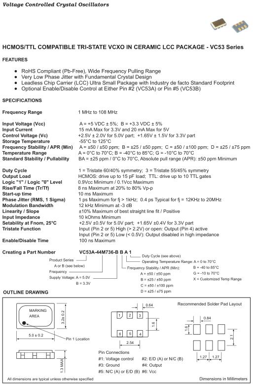 | Control Voltage (Vc) | +2.5V ± 2.0V for 5.0V part; +1.65V ± 1.5V for 3.3V part |