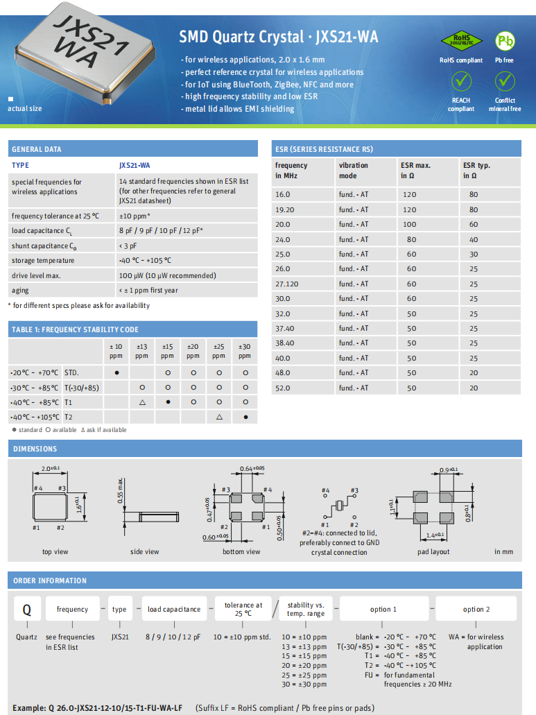 | Q 19.2-JXS21-9-10/10-WA-LF | Jauch晶振 | JXS21-WA | 19.2MHz |