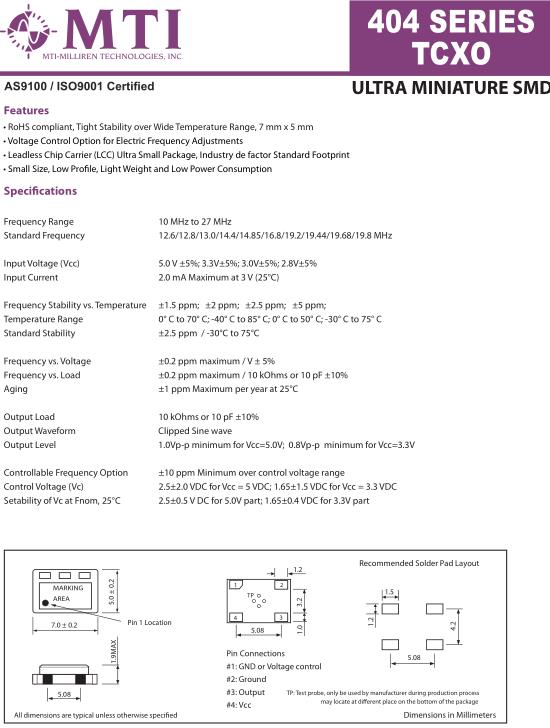 MTI晶振,404晶振,TCXO振蕩器,溫補(bǔ)晶振(TCXO)產(chǎn)品本身具有溫度補(bǔ)償作用,高低溫度穩(wěn)定性:頻率精度高0.5PPM-2.0PPM,工作溫度范圍:-30度至85度,電源電壓:1.8V~3.3V之間可供選擇,產(chǎn)品本身具有溫度電壓控制功能,世界上最薄的晶振封裝,頻率:26兆赫,33.6兆赫,38.4兆赫,40兆赫,因產(chǎn)品性能穩(wěn)定,精度高等優(yōu)勢(shì),被廣泛應(yīng)用到一些比較高端的數(shù)碼通訊產(chǎn)品領(lǐng)域,GPS全球定位系統(tǒng),智能手機(jī),WiMAX和蜂窩和無(wú)線通信等產(chǎn)品,符合RoHS/無(wú)鉛.
