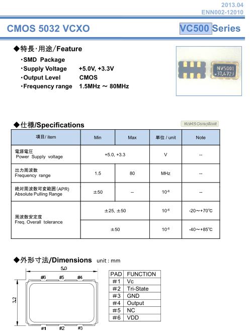 NAKA晶振,VC500晶振,VCXO晶振,5032mm體積的石英晶體振蕩器,有源晶振,該產品可驅動2.5V的溫補晶振,壓控晶振,VC-TCXO晶體振蕩器產品,電源電壓的低電耗型,編帶包裝方式,可對應自動高速貼片機自動焊接,及IR回流焊接(無鉛對應),為無鉛產品,超小型,質地輕.產品被廣泛應用到集成電路,程控交換系統,無線發射基站.納卡晶振公司是使用模擬電路技術,擅長定制規格的水晶設備制造廠。有強烈要求“低相位噪聲、高頻、高信賴性”的通信設備、廣播設備、測量儀器、交通基礎設施、醫療器械、防衛設備。另外,現在已經成為問題了,對生產中止,實現長期性的產品供應,以滿足顧客未來的企業為目標。