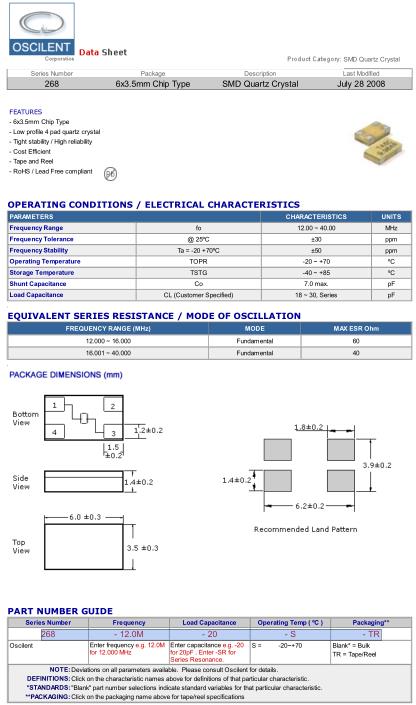 Oscilent晶振,268晶振,268-12.0M-20-S-TR晶振
