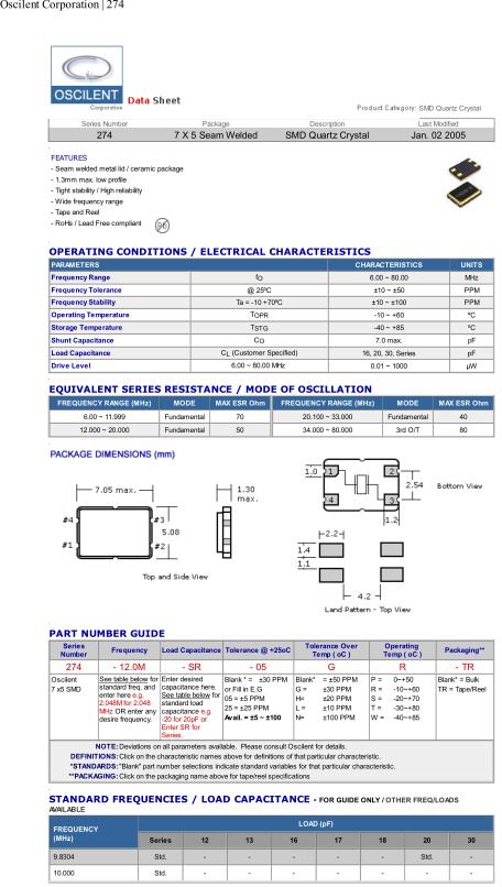 Oscilent晶振,274晶振,274-12.0M-SR-05-G-R-TR晶振,貼片晶振本身體積小,超薄型石英晶體振蕩器,特別適用于有目前高速發(fā)展的高端電子數碼產品,因為晶振本身小型化需求的市場領域,小型,薄型是對應陶瓷振蕩器(偏差大)和普通的石英晶體振蕩器(偏差小)的中間領域的一種性價比較出色的產品.產品廣泛用于筆記本電腦,無線電話,衛(wèi)星導航SSD,USB,Blu-ray等用途,符合無鉛焊接的高溫回流焊曲線特性.Oscilent晶振公司發(fā)展歷程: