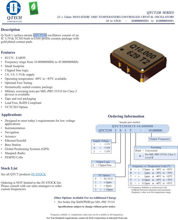 作為美國領先的MIL-PRF-55310合格產品制造商以及航空航天公司TOR(GPS III)和NASA GSFC規格等超高可靠性標準,Q-Tech自豪地為軍事,航空航天,井下服務,和我們的客戶合作四十年,在深空工業中取得無限成功。由Q-Tech設計和制造的零件在地殼以下數公里的范圍內,以及遠遠超出太陽系的深空任務中都表現出色。Q-TECH研發和生產的先進振蕩器主要用于高可靠性軍事,航空航天,鉆井設備和太空應用。Q-TECH的產品不僅包含標準時鐘振蕩器,也有高穩定性的恒溫晶振,TCXO振蕩器等元件.Q-Tech晶振,QTCT230晶振,QTCT2303S1T-10.000000晶振.