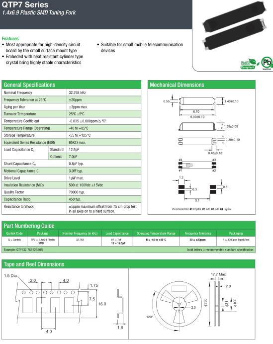 QANTEK晶振,QTP7晶振,QTP732.76812B20R晶振,貼片表晶32.768K系列具有超小型,薄型,質地輕的表面貼片音叉型石英晶體振蕩器,晶振產(chǎn)品本身具備優(yōu)良的耐熱性,耐環(huán)境特性,在辦公自動化,家電領域,移動通信領域可發(fā)揮優(yōu)良的電氣特性,符合無鉛標準,滿足無鉛焊接的回流溫度曲線要求,金屬外殼的石英晶振使得產(chǎn)品在封裝時能發(fā)揮比陶瓷晶振外殼更好的耐沖擊性能.