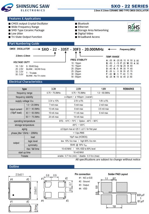 新松晶振,SXO-22晶振,SXO-22-33ST-30F3-20.000MHz晶振,小型SMD有源晶振,從最初超大體積到現在的7050mm,6035mm,5032mm,3225mm,2520mm體積,有著翻天覆地的改變,體積的變小也使產品帶來了更高的穩定性能,接縫密封石英晶體振蕩器,精度高,覆蓋頻率范圍寬的特點,SMD高速自動安裝和高溫回流焊設計,Optionable待機輸出三態輸出功能,電源電壓范圍:1.8V~5V,高穩定性,低抖動,低功耗,主要應用領域:無線通訊,高端智能手機,平板筆記本WLAN,藍牙,數碼相機,DSL和其他IT產品的晶振應用,三態功能,PC和LCDM等高端數碼領域,符合RoHS/無鉛.SHINSUNG晶振公司的發展如下: