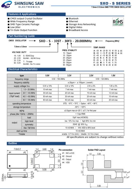 新松晶振,SXO-S晶振,SXO-S-33ST-30F3-20.000MHz晶振,小型SMD有源晶振,從最初超大體積到現在的7050mm,6035mm,5032mm,3225mm,2520mm體積,有著翻天覆地的改變,體積的變小也使產品帶來了更高的穩定性能,接縫密封石英晶體振蕩器,精度高,覆蓋頻率范圍寬的特點,SMD高速自動安裝和高溫回流焊設計,Optionable待機輸出三態輸出功能,電源電壓范圍:1.8V~5V,高穩定性,低抖動,低功耗,主要應用領域:無線通訊,高端智能手機,平板筆記本WLAN,藍牙,數碼相機,DSL和其他IT產品的晶振應用,三態功能,PC和LCDM等高端數碼領域,符合RoHS/無鉛.SHINSUNG晶振公司的發展如下:
