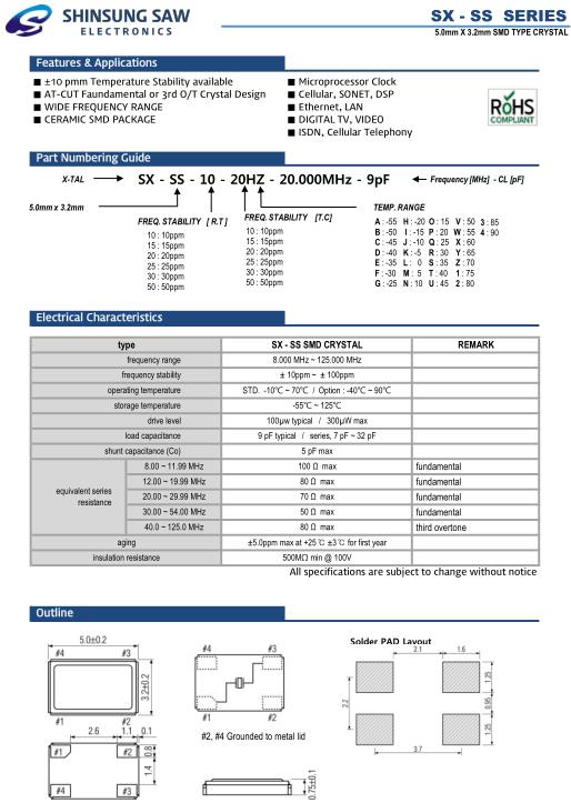 SHINSUNG Crysta成立于1990年,并開始生產石英晶振,濾波器,石英晶體振蕩器,向客戶提供最新的最新的新松貼片晶振或通孔型晶振單元,時鐘有源晶振,溫補晶振等晶振產品,一直以供應優質晶振產品為信念,不斷給社會創造價值.新松晶振,SX-SS晶振,SX-SS-10-20HZ-20.000MHz-9pF晶振.