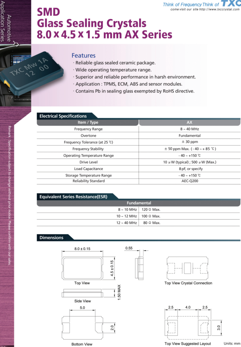 TXC汽車晶體,汽車中控晶振,AX-28.224MAGQ-T晶振,臺(tái)灣TXC晶振公司,汽車級(jí)晶振,無源晶振,車載USB晶振,高精度晶振,耐高溫晶振,高品質(zhì)晶振,臺(tái)產(chǎn)晶振,8045晶振,貼片晶振,陶瓷面晶振,二腳晶振,AX系列貼片玻璃密封晶體,8.0 x4.5 x 1.5毫米。特點(diǎn).可靠的玻璃密封陶瓷封裝。.工作溫度范圍寬。.惡劣環(huán)境下性能優(yōu)越、可靠。·應(yīng)用領(lǐng)域:TPMS,ECM,ABS和傳感器模塊。-不受RoHS指令限制的密封玻璃中含有鉛