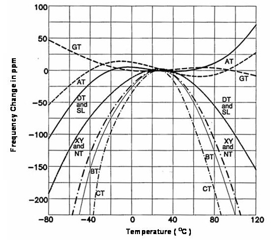 大部份的石英晶體產(chǎn)品是用于電子線路上的參考頻率基準(zhǔn)或頻率控制組件, 所以, 頻率與工作環(huán)境溫度的特性是一個很重要的參數(shù). 事實上, 良好的頻率與溫度(frequeny versus temperature)特性也是選用石英做為頻率組件的主要因素之一. 經(jīng)由適當(dāng)?shù)亩x及設(shè)計, 石英晶體組件可以很容易的就滿足到以百萬分之一 (parts per million, ppm) 單位等級的頻率誤差范圍. 若以離散電路方式將LCR零件組成高頻振蕩線路, 雖然也可以在小量生產(chǎn)規(guī)模達(dá)到所需要的參考頻率信號誤差在ppm或sub-ppm等級要求, 可是這種方式無法滿足產(chǎn)業(yè)要達(dá)到的量產(chǎn)規(guī)模. 石英組件的頻率對溫度特性更是離散振蕩線路無法簡易達(dá)成的. 在(圖) 中提供了數(shù)種不同的石英晶體切割角度的頻率對溫度特性曲線.