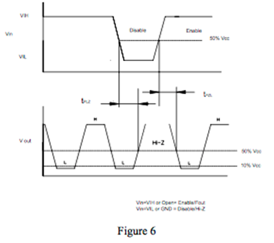 在三態(tài)函數(shù)生效之前總會(huì)有一些延遲.在兩個(gè)轉(zhuǎn)換(禁用和啟用時(shí))都會(huì)發(fā)生此效果.從低電平開(kāi)始的三態(tài)輸出禁止時(shí)間是tPLZ,三態(tài)到低電平的輸出使能時(shí)間是tPZL.(圖6)